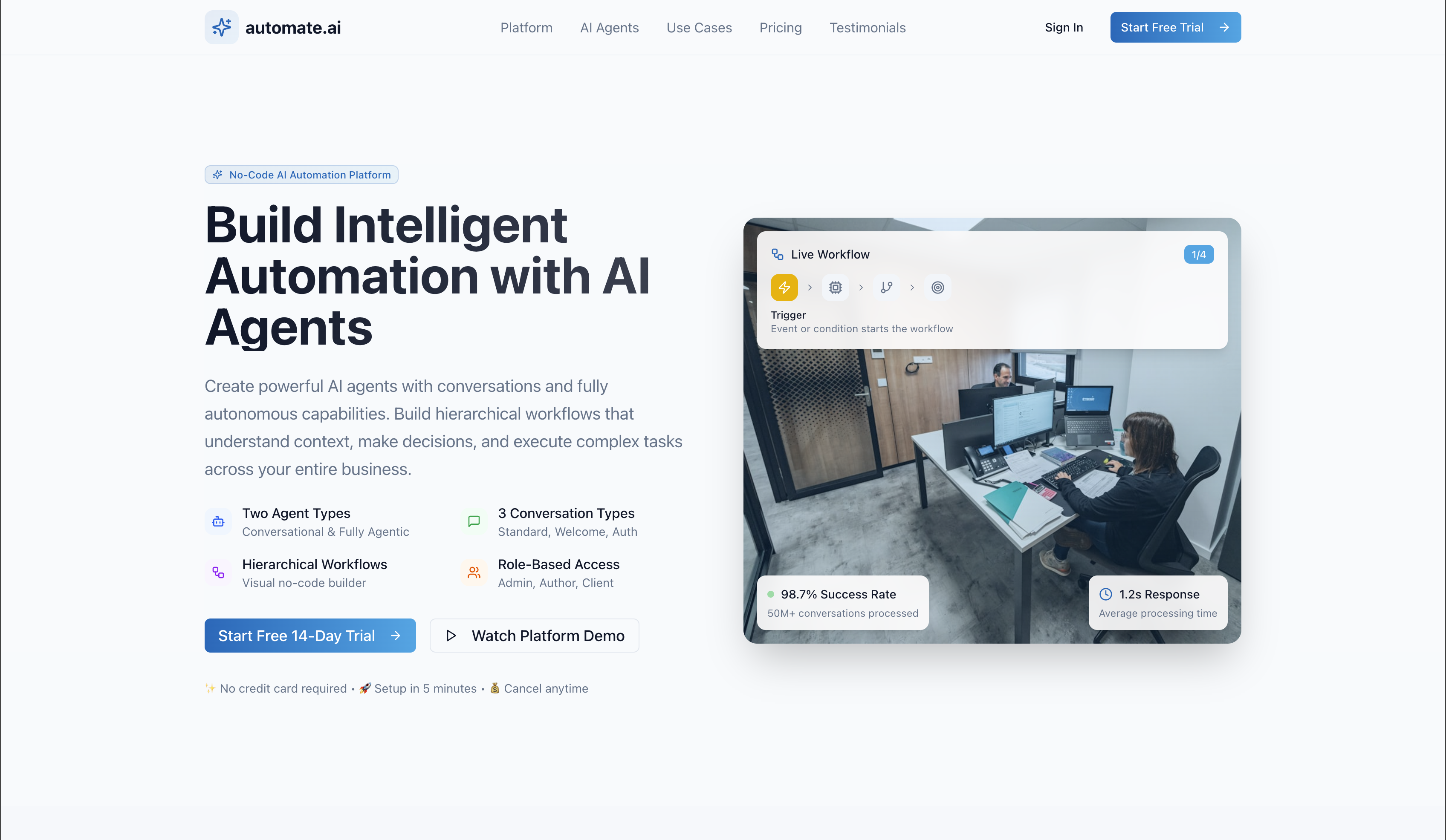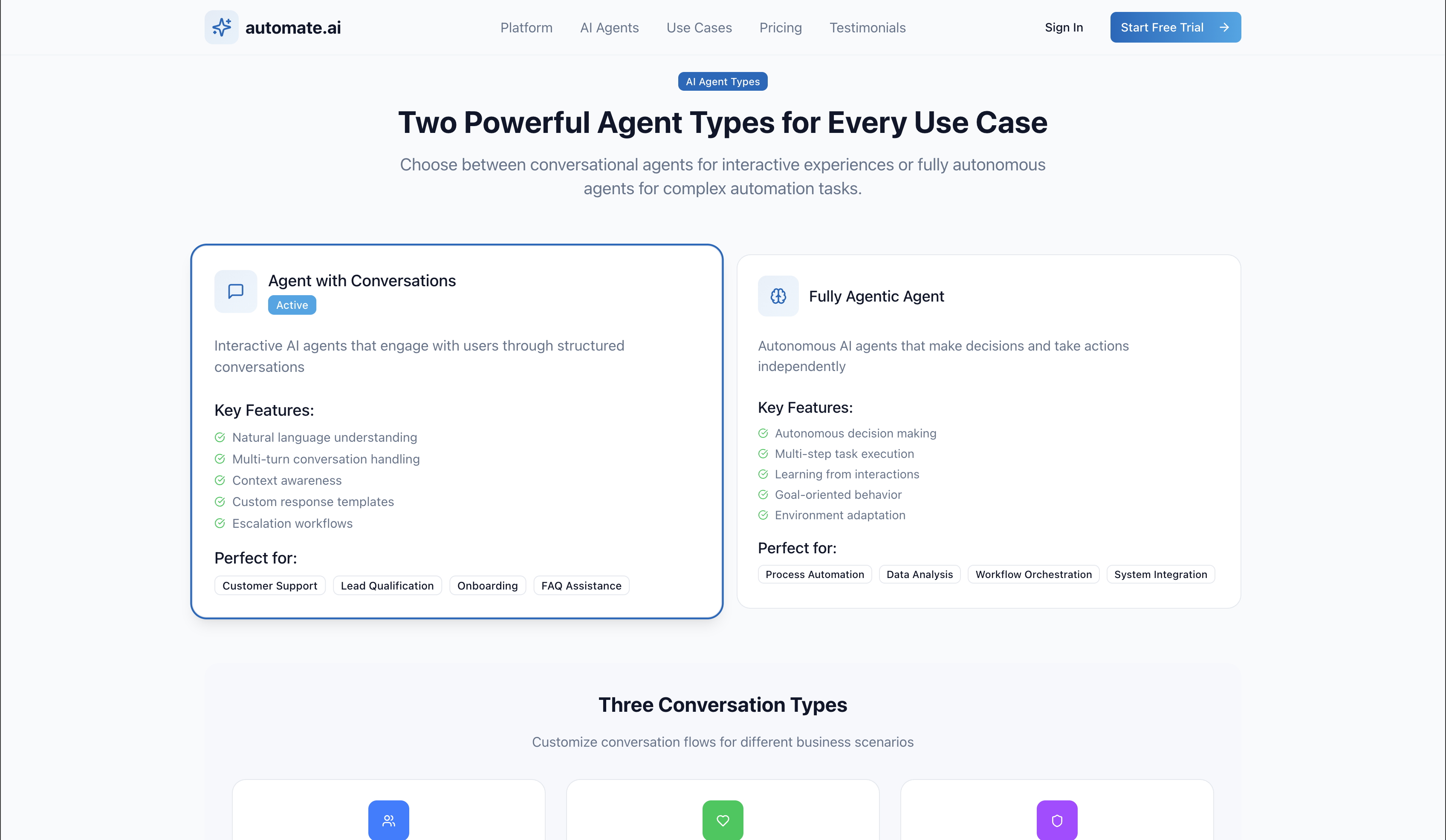 Create powerful AI agents with conversations and fully autonomous capabilities. Build hierarchical workflows that understand context, make decisions, and execute complex tasks across your entire business.