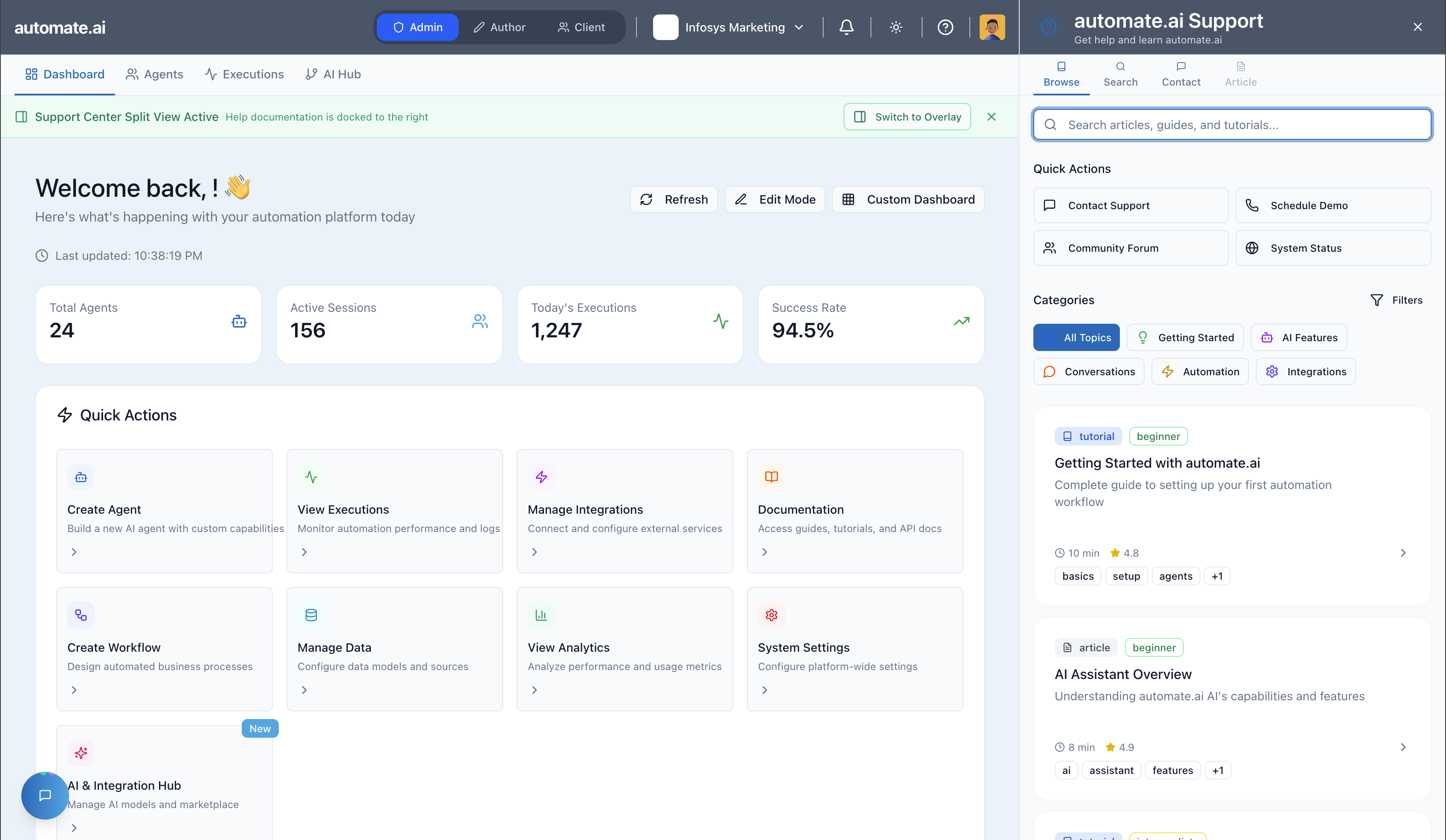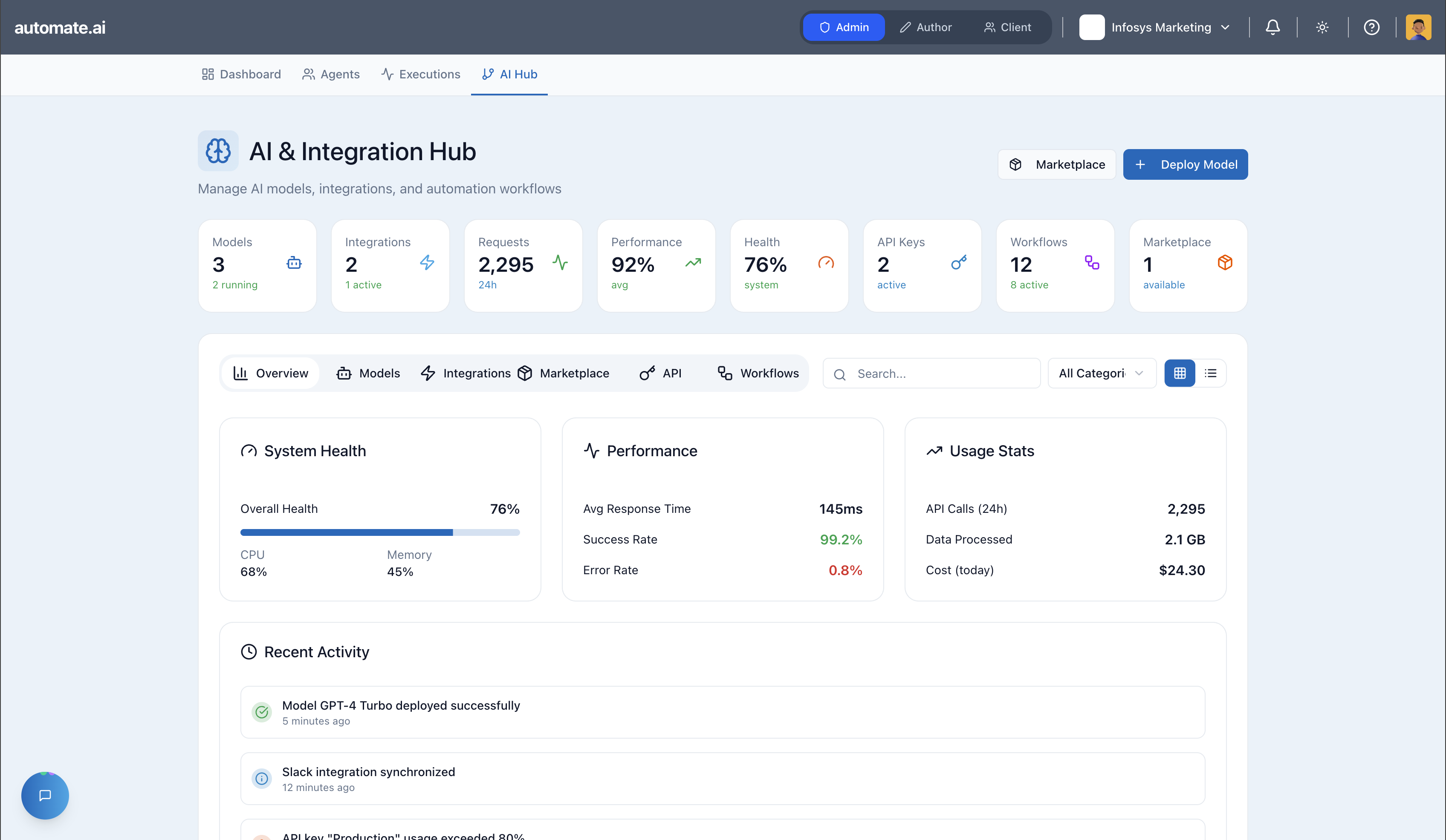 Control, governance, and scalability.Admins oversee the entire automation ecosystem — managing agents, workflows, and user permissions. The interface is designed for clarity and oversight.